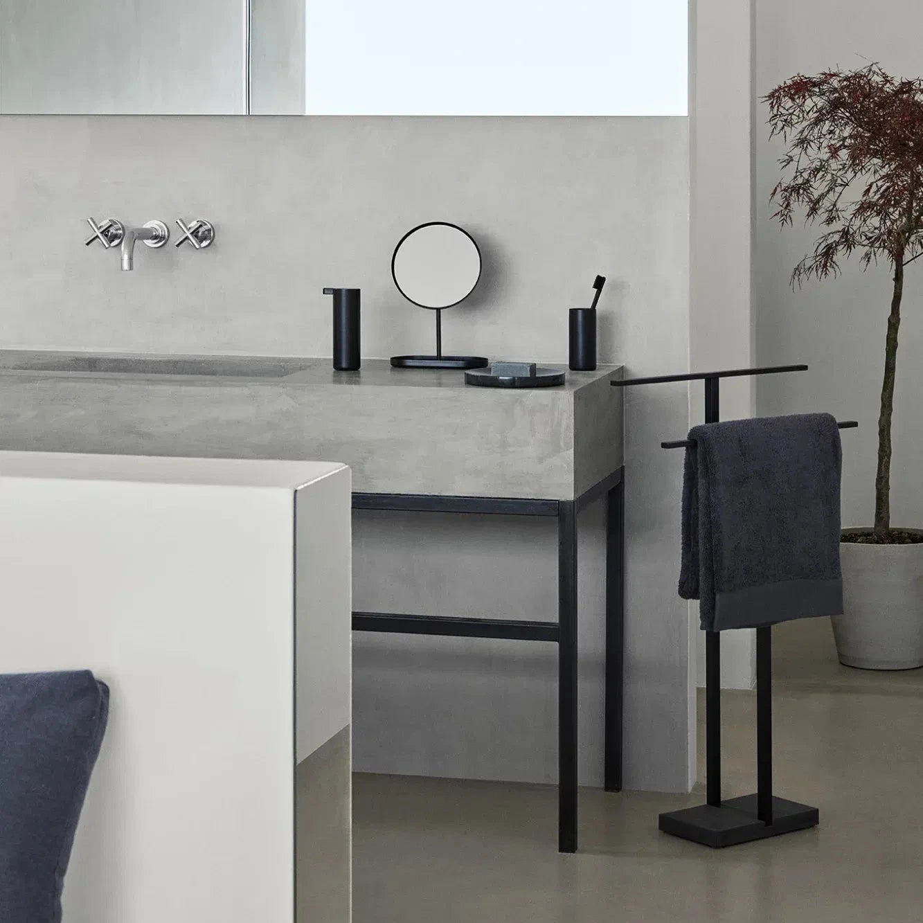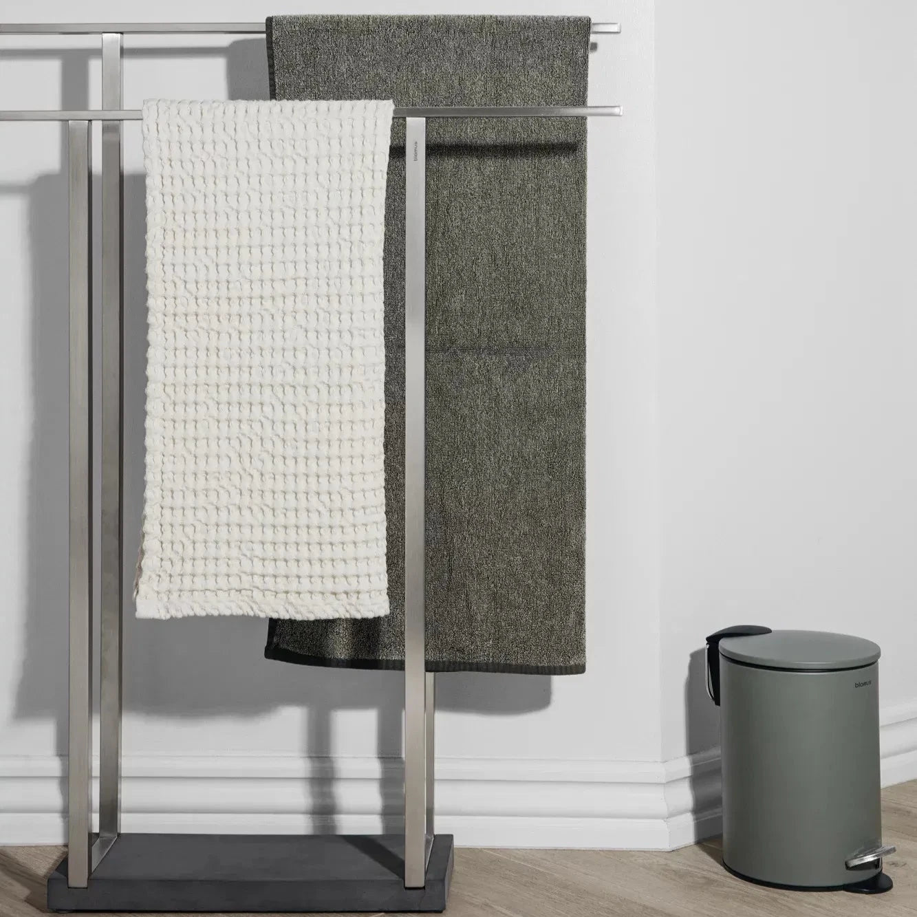 Der Handtuchhalter kann frei im Bad positioniert werden und an zwei langen Ablagestangen sind Handtücher immer griffbereit, können aber auch zum Trocknen nach dem Duschen aufgehangen werden. Die stabile Konstruktion und die Kunststeinbodenplatte machen den Handtuchhalter standfest. Das Vierkant Edelstahlrohr ist in den PolyStonefuß eingelassen, durchzieht die Bodenplatte und es entsteht ein besonders hochwertiges Detail.